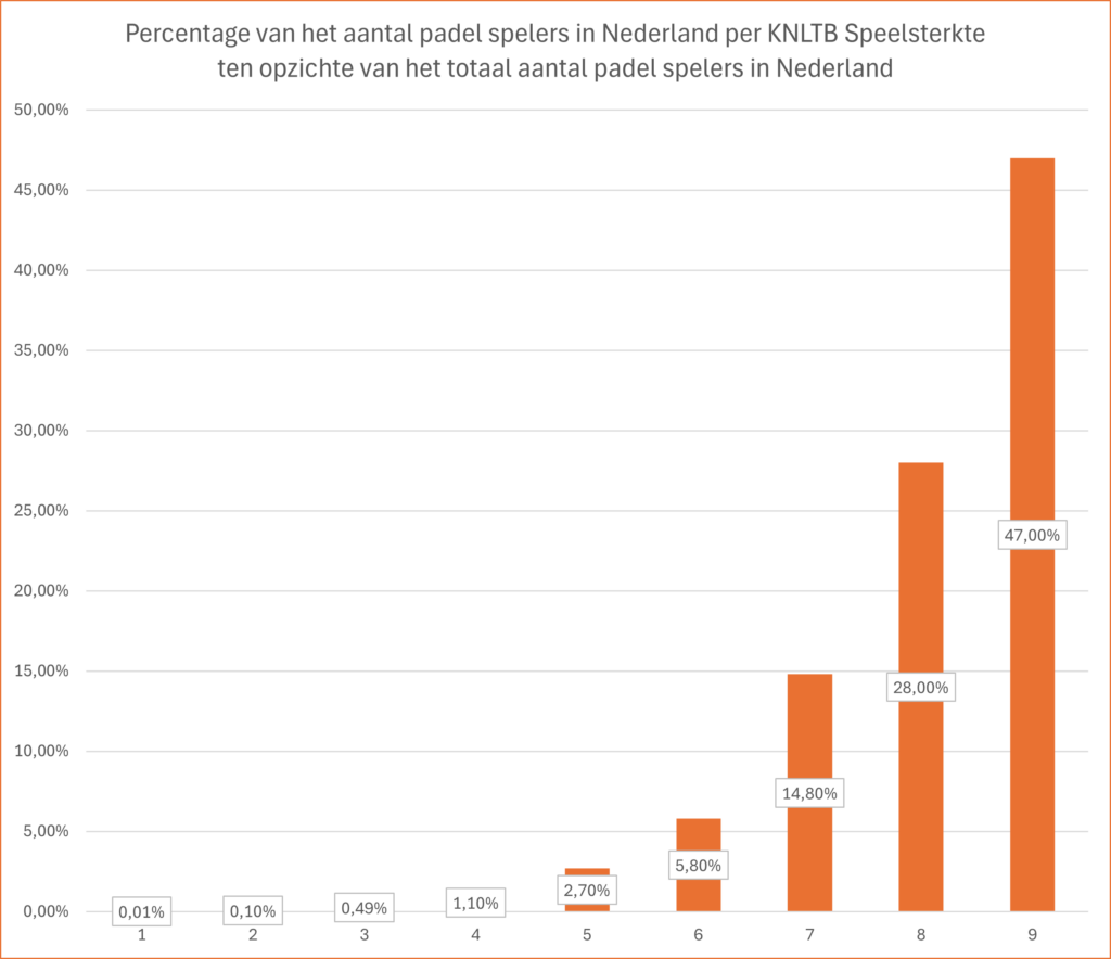 Heb je KNLTB Speelsterkte 9, dan behoor je tot 100 % beste padel spelers van Nederland oftewel jij speelt net zo goed als 47 % van alle padel spelers van Nederland, en 53 % speelt beter padel dan jij.